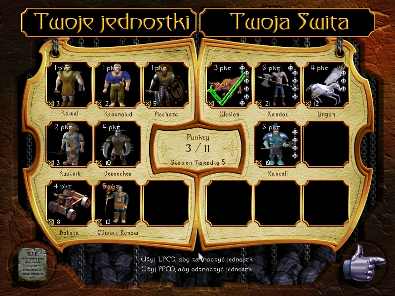 Po prawej w ekranie przedbitewnym znajdują się jednostki świty, zielonym "ptaszkiem" oznaczono wybraną jednostkę